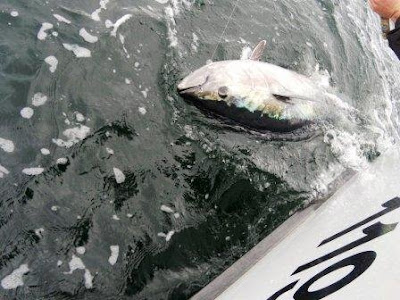 Headed out to the Bank, with hopes of more tuna showing up north after the moon. Arrive to the corner with lots of life showing. The usual whales,birds,tons of bait with many bass still in the mix. No tuna on the screen cruised around for a bit and sure enough a few broke the surface. Worked the area for a while and sure enough we were on. About 15 to 20 min later we boated a nice 68″ fish. This class of fish will give you a good battle make sure your gear is heavy and in tip top shape. As soon as it began it shut off. Weather was no good of course and visibility was tough. Stuck it out and kept working, a while later we were on again. A fish of the same size was boat side for a nice tag and release. A great day overall our clients were very excited to say the least. Fishing should continue to improve. I hope this weather pattern changes as well. Good luck to all !. Thanks